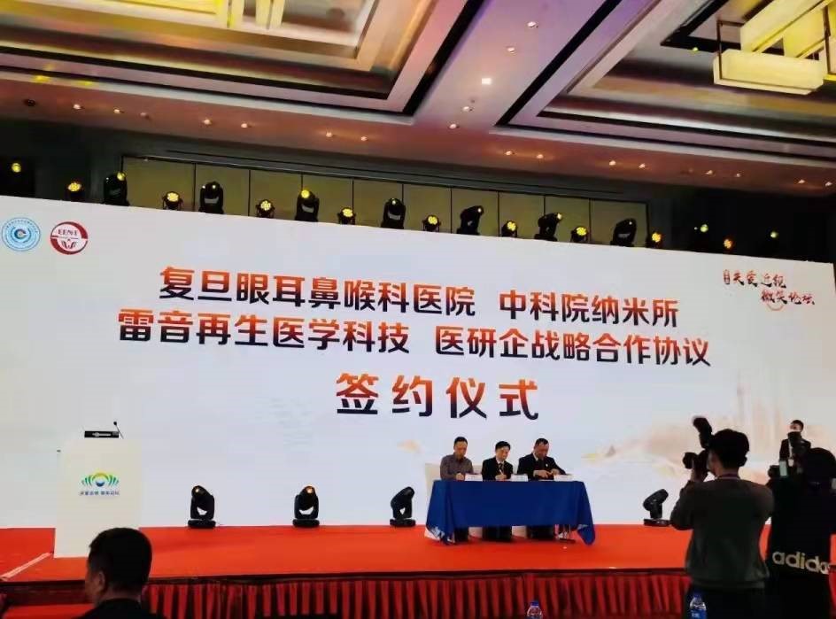 大会开幕式上还举行了医研企(复旦大学附属眼耳鼻喉科医院、中科院苏州纳米技术及纳米仿生研究所戴建武教授课题组和雷音再生医学科技有限公司)三方签约仪式,分别由复旦大学附属眼耳鼻喉科医院院长周行涛教授、中科院苏州纳米技术及纳米仿生研究所戴建武教授及雷音再生医学科技有限公司姜棠亮总经理上台完成签约。通过医研企协同合作来加强科技创新力度,做好角膜透镜再生转化的研发、保存和临床应用。